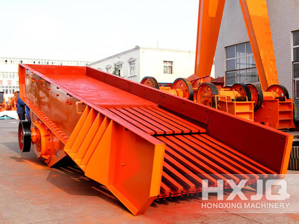 Ore vibrating feeder is mainly used for continuously and evenly feeding coarse crusher, screening fine aggregate, thus enhancing crusher capacity. When operating, the ore vibrating feeder can send massive and granular materials to the receiving device evenly, regularly and continuously. In the sand making production line, its even and continuous feeding helps avoid feeding-hole blocking. It can also roughly screen the materials.